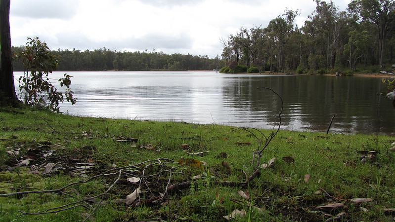 A night of rain, sounded worse because of the tin roof, and I set off with it still in the air, but dissipating. Soon, it was a really pleasant walk around Glen Mervyn Dam, and I was in warm sunshine on the hill down to the Mumballup Tavern.